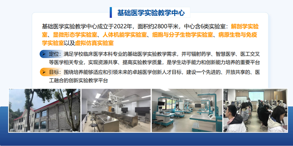 重庆大学医学院基础医学实验教学中心(简称“实验教学中心”)成立于2022年,是医学院开展本科教育、落实立德树人根本任务、强化实践育人成效的重要基地。中心坐落于重庆大学C校区,由第三、四教学楼改建而成,总建筑面积约2750平方米。围绕“以器官系统为主线、以临床问题为导向”的教学特色,中心规划设置了解剖学实验室、显微形态学实验室、人体机能学实验室、细胞与分子生物学实验室、病原生物与免疫学实验室及虚拟仿真实验室共6类实验室。为契合医学院“高起点、研究型、入主流、有特色”的建设定位,中心坚持走探索创新的发展道路,充分发挥后发优势,致力于打造高水平教学实验室。实验教学中心的设立,不仅能够满足本科生基础医学实验教学需求,更为实现资源共享、提升实验教学质量提供了坚实保障,成为培养新型医学人才的重要支撑平台。