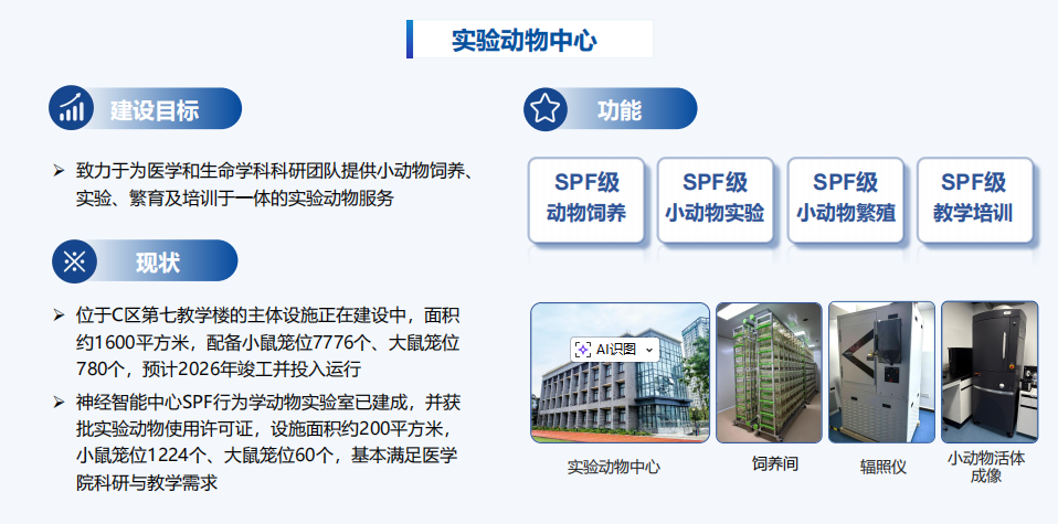 在设施建设方面,中心目前已建成并运行位于神经智能中心的SPF级实验动物平台,该平台已取得实验动物使用许可证,面积约200平方米,配备小鼠笼位1224个、大鼠笼位60个,能够有效满足医学院当前科研与教学的迫切需求。